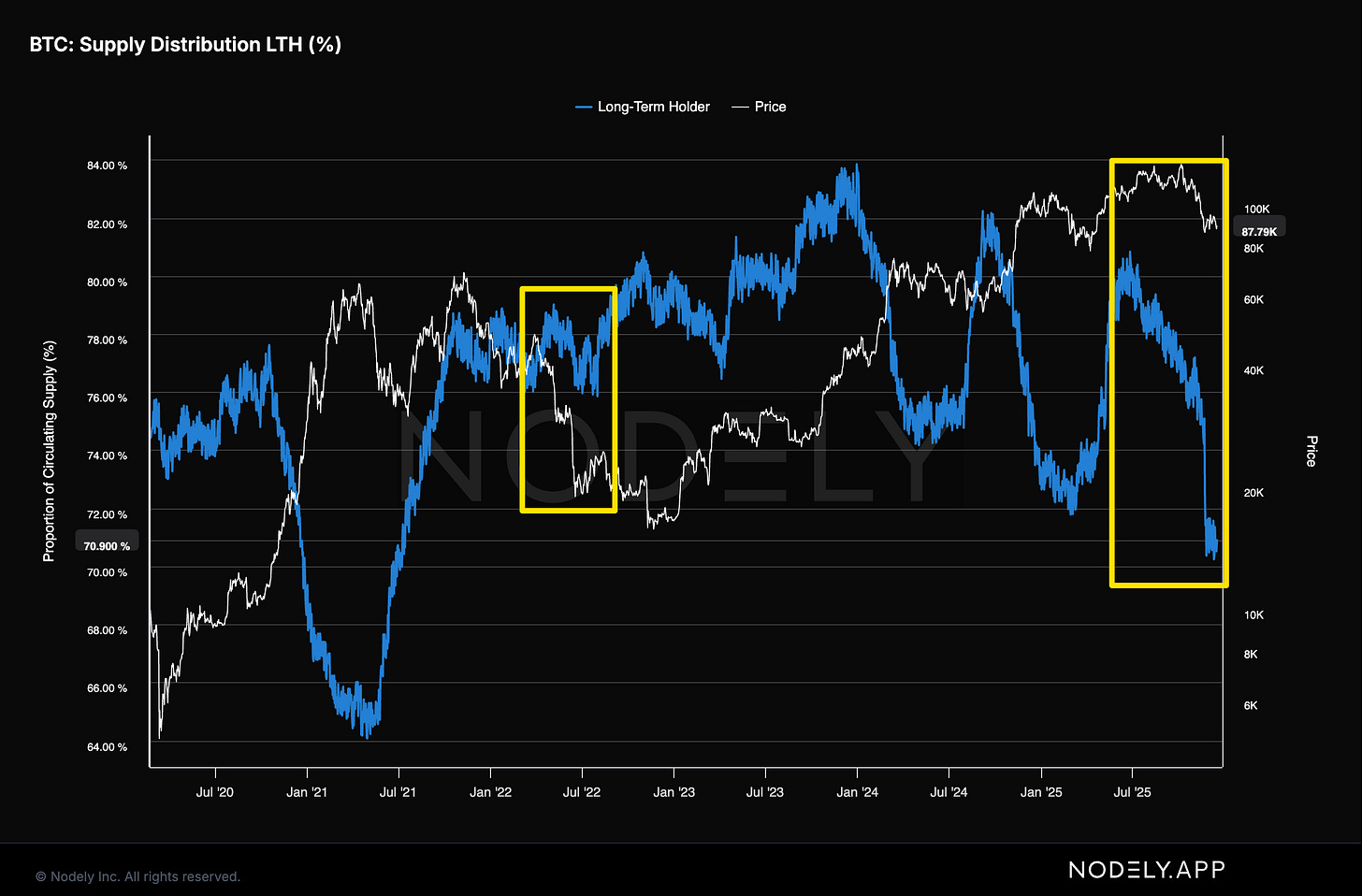 Aşağıdaki grafik uzun vadeli yatırımcıların dağıtımını gösteriyor. Mavi çizgi aşağıya iniyorsa, uzun vadeliler satıyor demek. Yükseliş dönemlerinde bunun sıkça görürüz. Çünkü bu arkadaşlar satacak ki birileri (yeni gelenler) alacaklar.